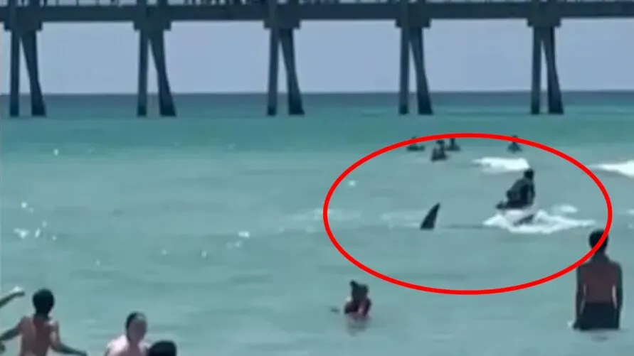 Banhistas passaram por um grande susto na praia de Navarre, na Flórida, Estados Unidos, após se depararem com um enorme tubarão nadando próximo a eles. Assim que notaram a presença do animal, uma correria se iniciou por parte das pessoas.