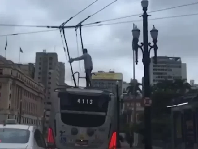 Um vídeo que viralizou nas redes sociais mostra um homem “surfando” em um ônibus elétrico no centro de São Paulo. O episódio ocorreu na manhã dessa terça-feira, 30, na Rua Libero Badaró.