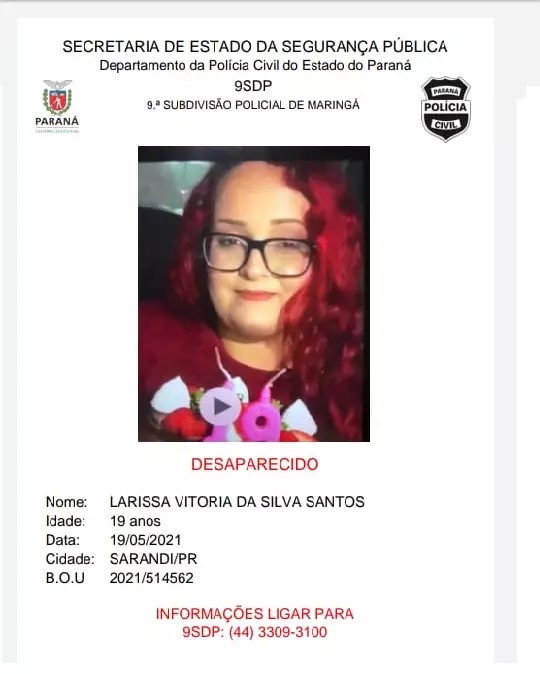 Quem tiver informações sobre o paradeiro da jovem Larissa Vitória da Silva Santos pode comunicar as autoridades policiais pelos telefones (44) 3309-3100, ou 191.