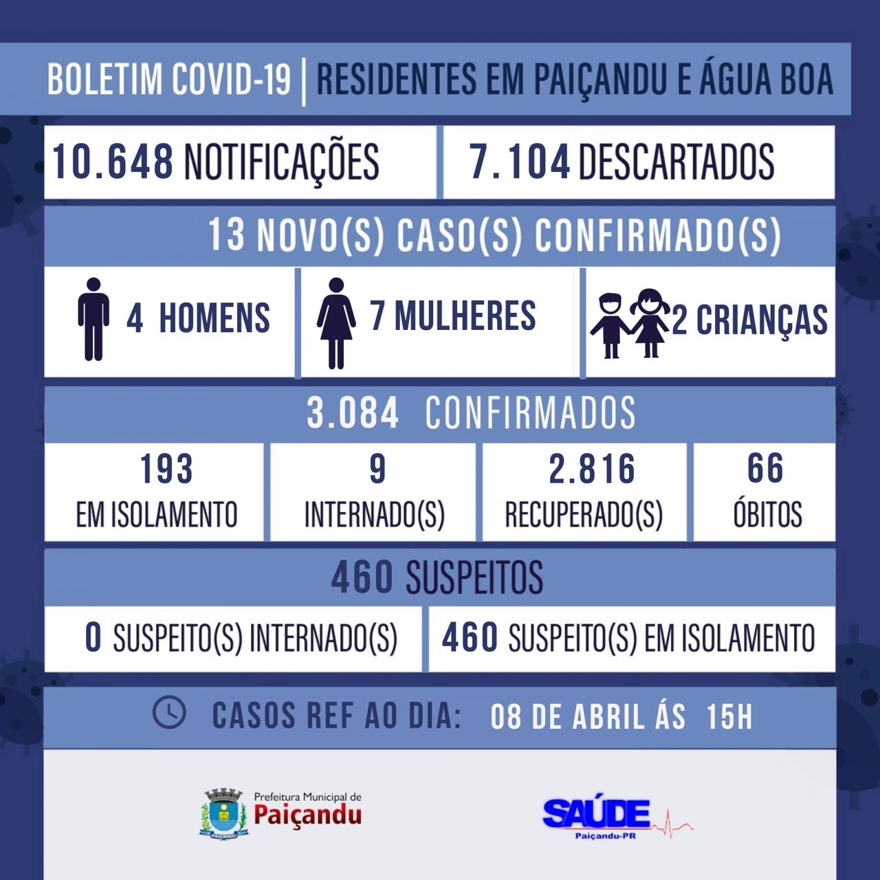 Atualmente, Paiçandu possui 193 pacientes positivados com orientação de isolamento domiciliar e outros 9 internados. Desde o início da pandemia, a cidade teve 3.084 casos confirmados de Covid-19, com 2.816 recuperados e 66 óbitos. Confira o boletim completo:
