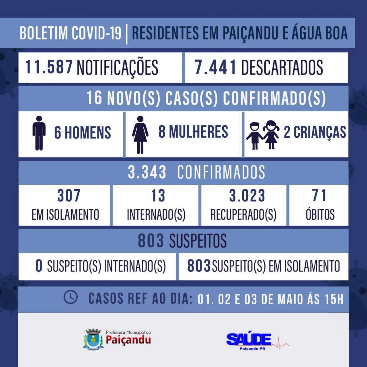 Paiçandu confirmou 16 novos casos de Covid-19 no boletim epidemiológico que acompanha a evolução da doença na cidade, divulgado na tarde desta segunda-feira, 03, pela Secretaria Municipal de Saúde. De acordo com o documento, entre os novos positivados, são 6 homens, 8 mulheres e 2 crianças.