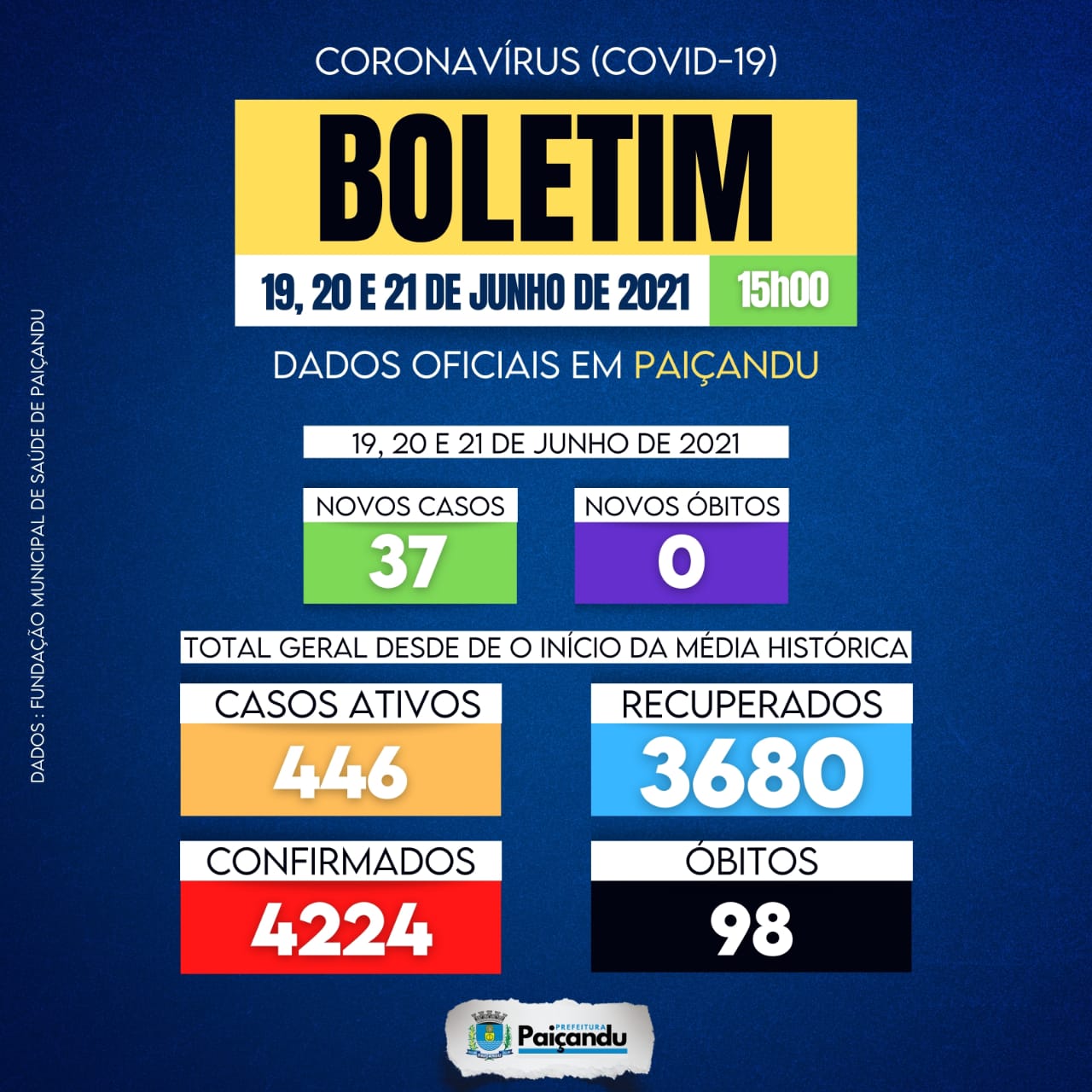 Atualmente, Paiçandu possui 446 casos ativos de Covid-19. Desde o início da pandemia, a cidade teve 4.224 casos confirmados, com 3.680 recuperados e 98 óbitos. Confira o boletim completo: