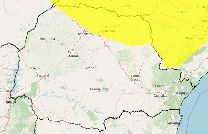 O Instituto Nacional de Meteorologia (Inmet) emitiu três alertas climáticos para precipitações no Paraná, de categoria amarela de perigo potencial. Para o Sistema de Tecnologia e Monitoramento Ambiental do Paraná (Simepar), no entanto, as condições meteorológicas indicam tempo estável sobre o interior do Paraná, com pancadas de chuva apenas entre os Campos Gerais e a faixa leste do estado.