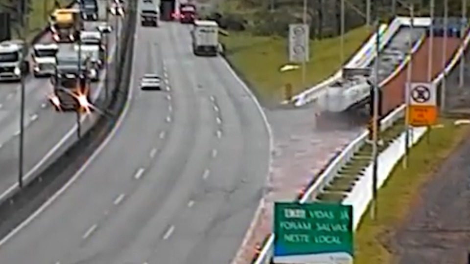 Câmeras de segurança registraram quando o veículo de grande porte carregado com 36 toneladas de óleo vegetal entrou 85 metros na caixa de contenção após a perda de freios no km 671, por volta das 16h. O condutor não sofreu ferimentos, segundo a concessionária Arteris.