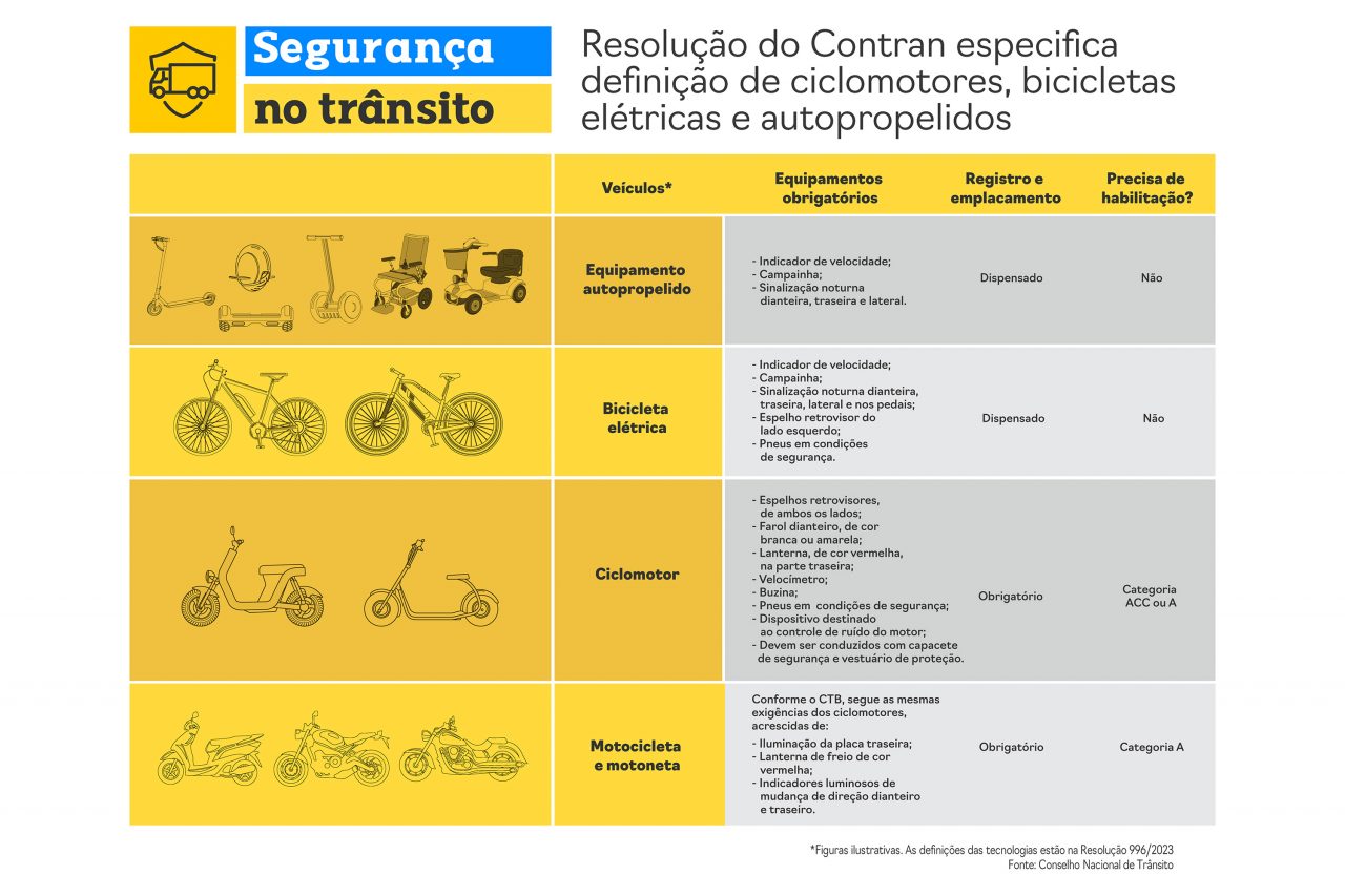 O Conselho Nacional de Trânsito (Contran), por meio da Resolução nº 996/2023, atualizou a classificação de ciclomotores, bicicletas elétricas e equipamentos de mobilidade individual autopropelidos, como patinetes e skates. O texto entrou em vigor no dia 1° de julho de 2023 e prevê o prazo entre 1° de novembro de 2023 e 31 de dezembro de 2025 para a regularização por parte dos proprietários de ciclomotores. Os condutores de bicicletas, mesmo elétricas, skates e patinetes não necessitam de qualquer tipo de documentação.