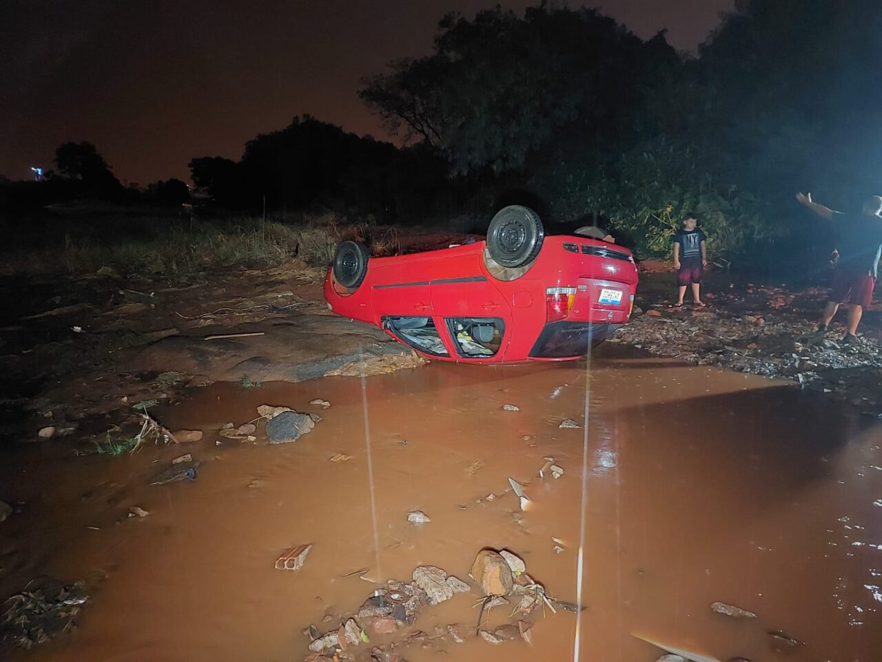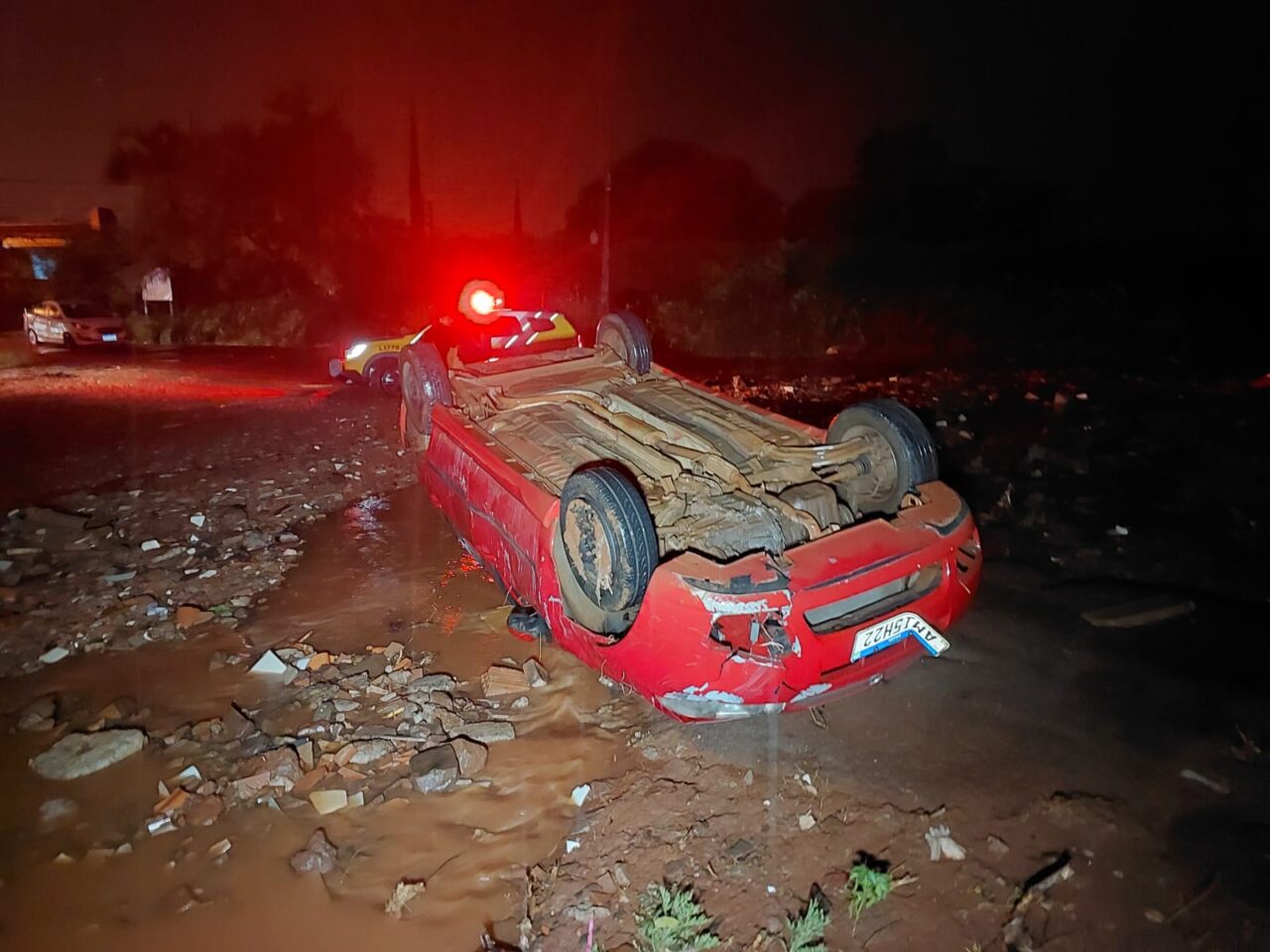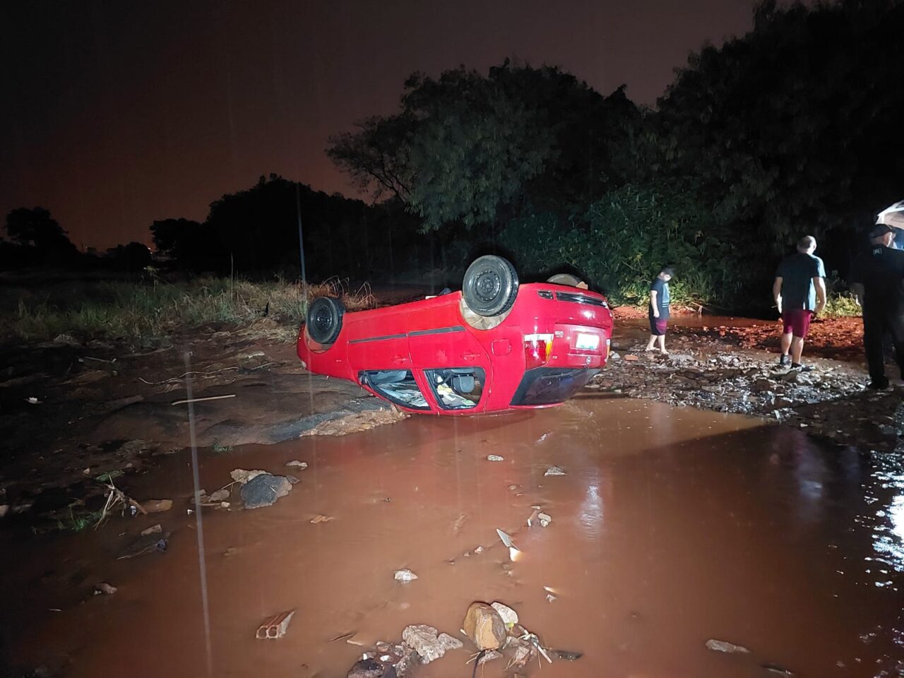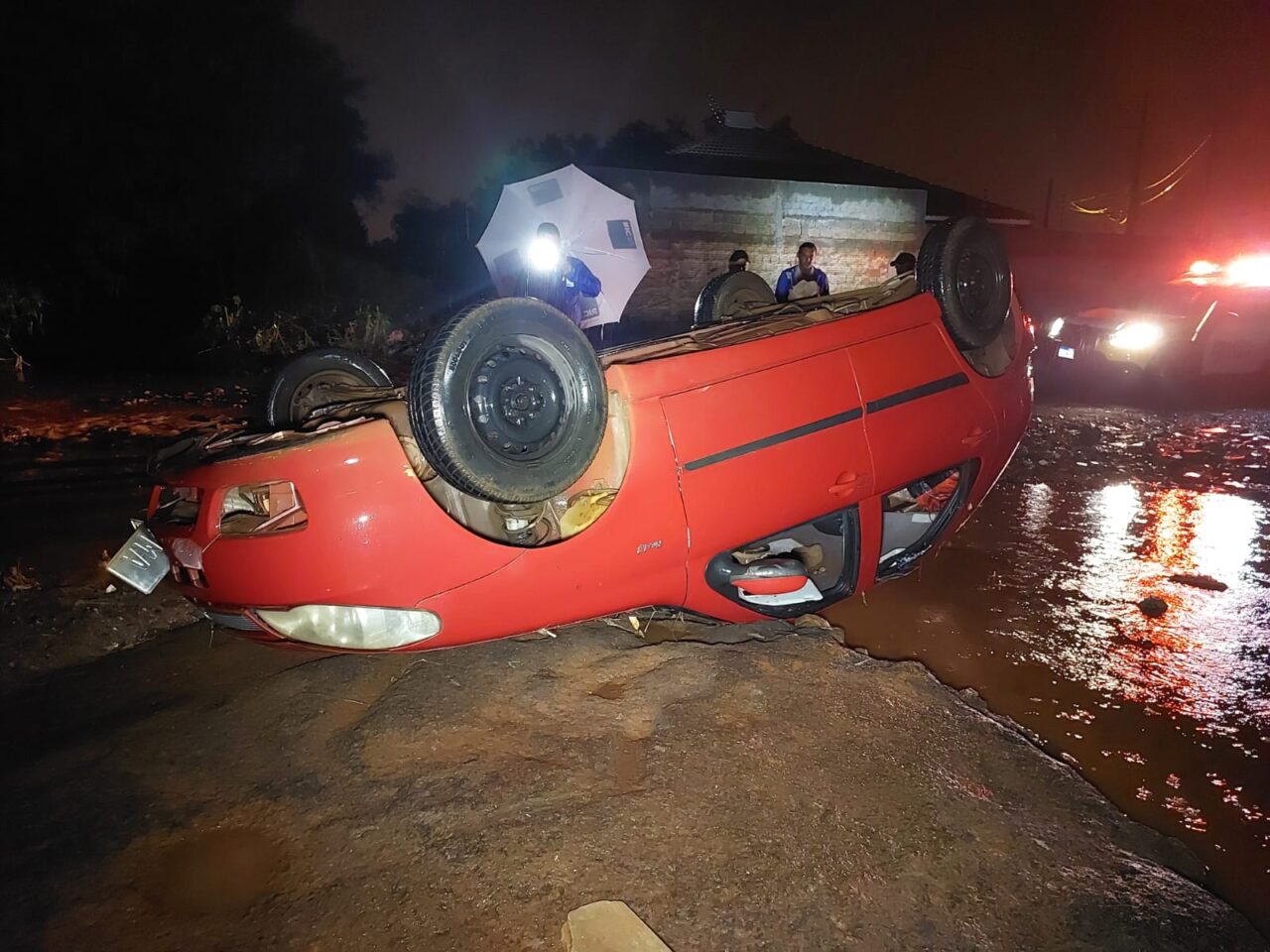 Na noite desta quinta-feira, 11, o caminhoneiro de profissão voltava do mercado com o filho quando começou a chover forte. O carro dele foi arrastado e tombado com a força da enxurrada, no final da Avenida Marangoni, em um trecho sem asfalto no Jardim Itália, em Sarandi.