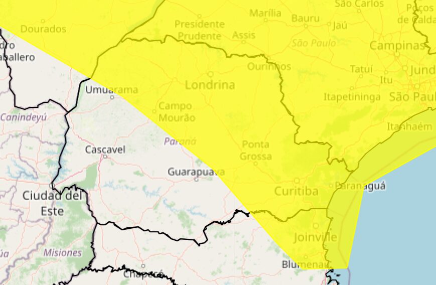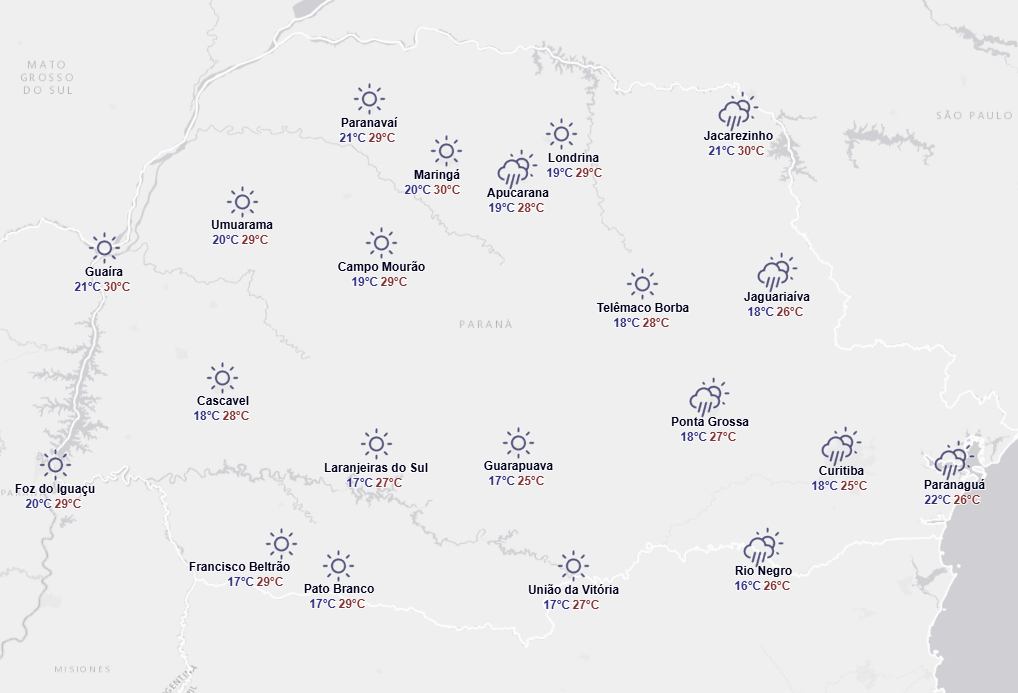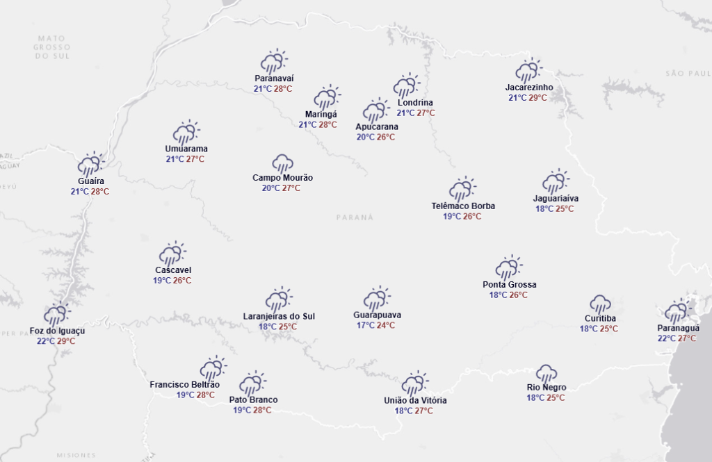 “Entre a Região Metropolitana de Curitiba (RMC) e o litoral, os acumulados de chuva deverão ser significativos, podendo superar os 50 mm em alguns pontos. As temperaturas máximas deverão atingir valores próximos dos 30°C nas regiões Sudoeste, Oeste, Noroeste, Norte Central, Norte Pioneiro e no litoral, enquanto no Centro-Sul, Sudeste, Campos Gerais e na RMC, as máximas ficarão em torno de 25°C”.