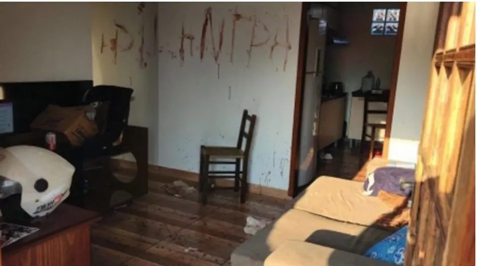 No momento em que a polícia chegou com o Samu se ouviam gritos de socorros de dentro da residência. Os policiais entraram no terreno e efetuaram o arrombamento da porta. O autor se negou a abrir a porta e correu para dentro da residência. O imóvel estava completamente tomado por sangue no chão e paredes, inclusive o autor escreveu ‘Pilantra’ com o sangue da vítima.