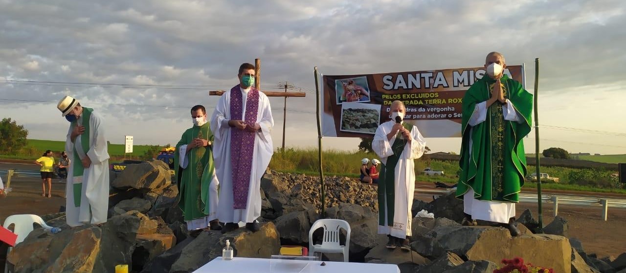Nesse domingo, 27, uma missa foi celebrada em protesto ao fechamento da estrada Terra Roxa. O altar foi montado sobre as pedras, chamadas pelos manifestantes de pedras da covardia, e a missa foi celebrada pelo padre Salvador Aparecido.