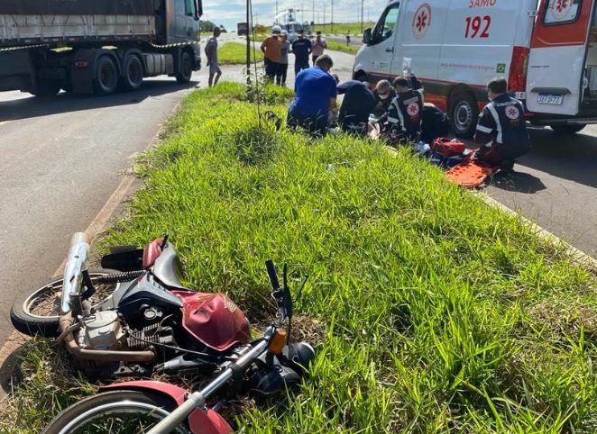 Um motociclista ficou ferido em estado grave em um acidente envolvendo uma carreta, no fim da manhã desta segunda-feira, 24, na rodovia PR-454, entre Astorga e Jaguapitã. O homem teve fratura exposta em uma das pernas com risco de amputação.