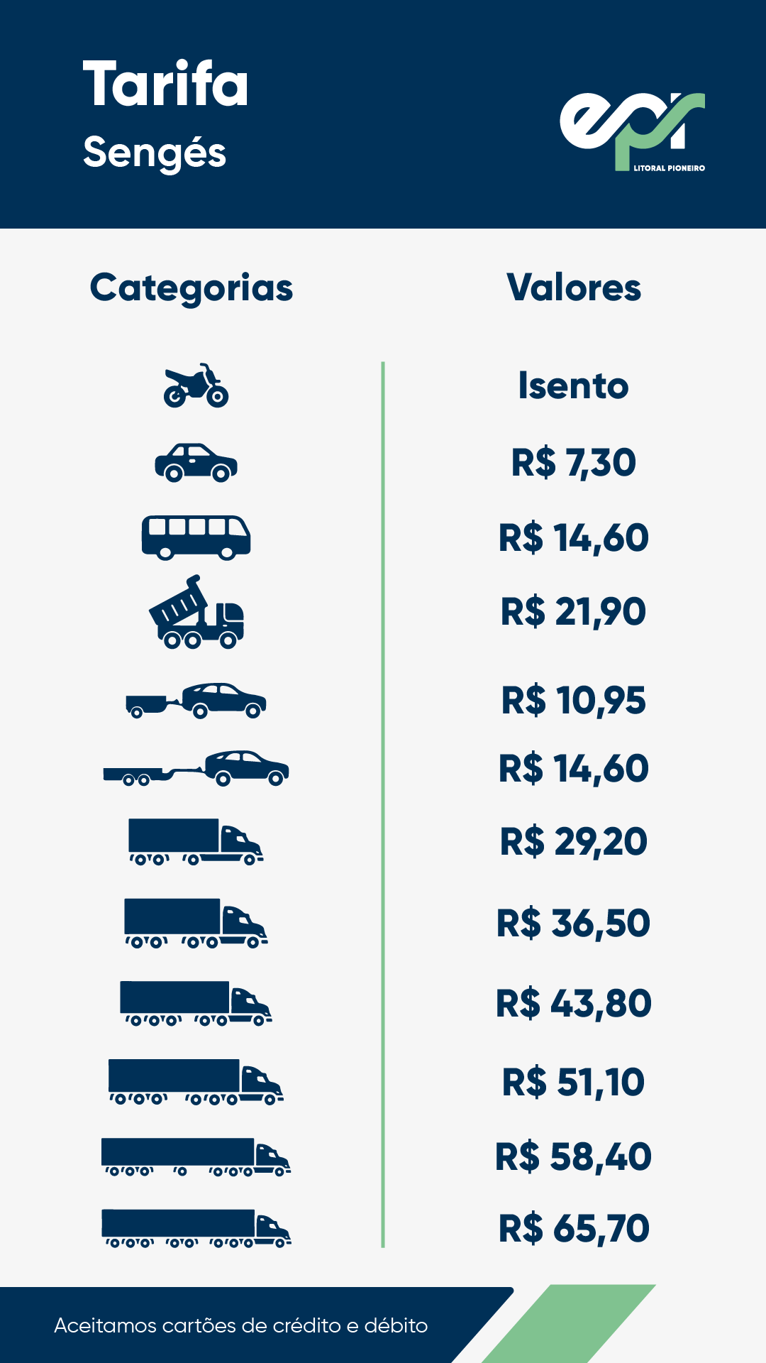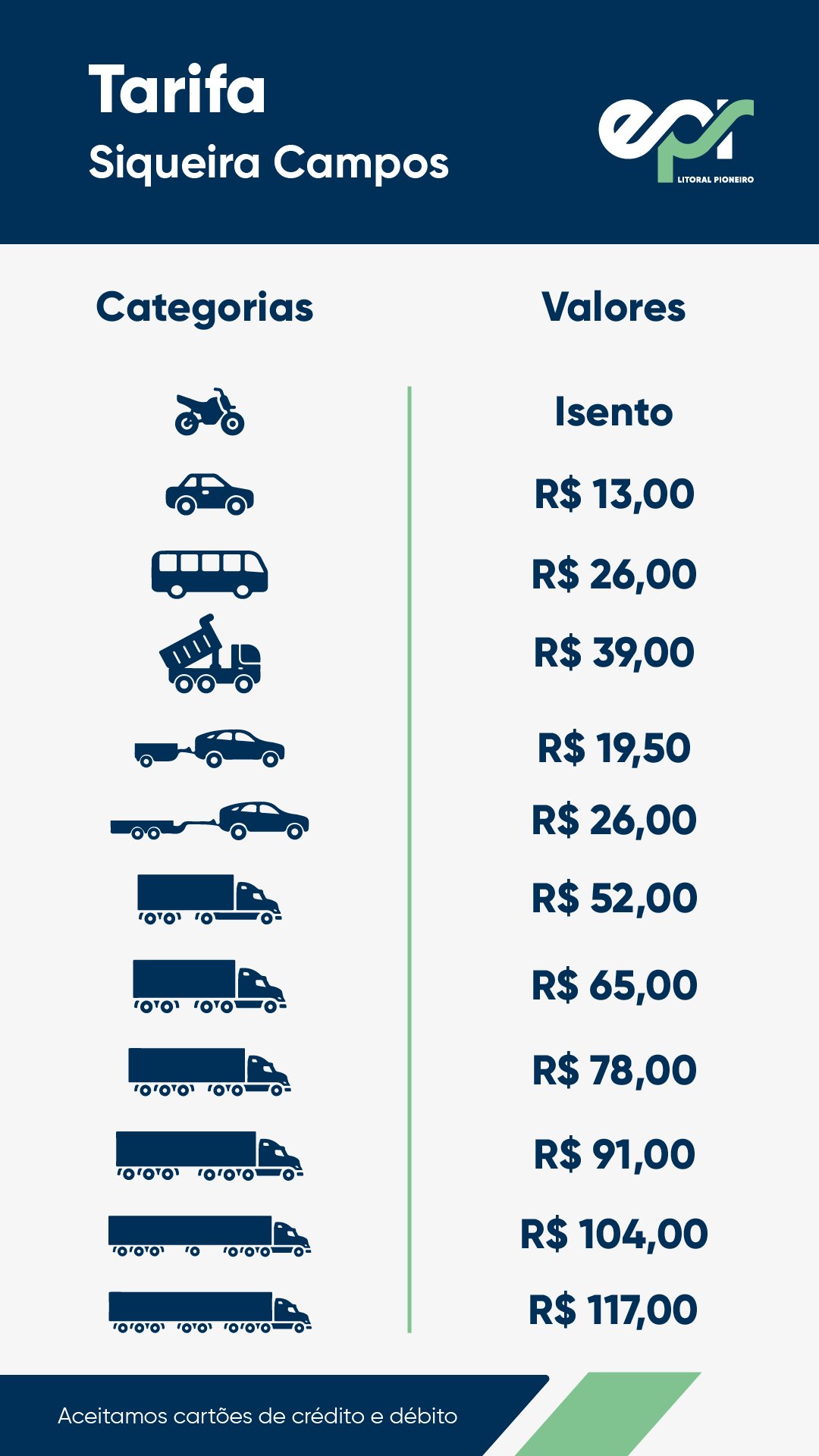 A partir da zero hora de terça-feira, 11 de março, começa a cobrança de tarifas em duas novas praças de pedágio sob concessão da EPR Litoral Pioneiro. As estruturas estão localizadas na PR-151, no km 184,820, em Sengés, onde a tarifa será a partir de R$ 7,30, e na PR-092, no km 286,750, em Siqueira Campos, com cobrança a partir de R$ 13.