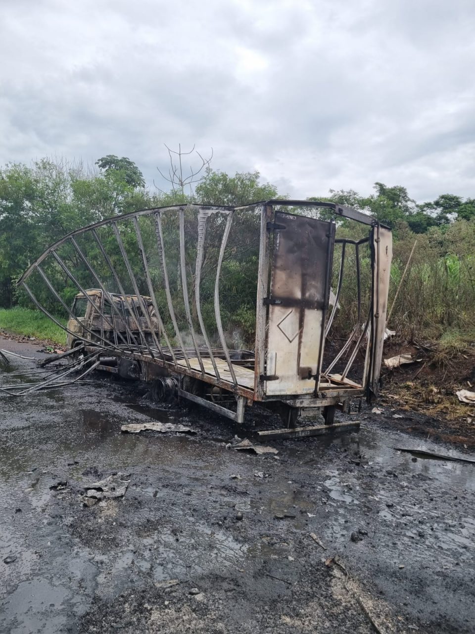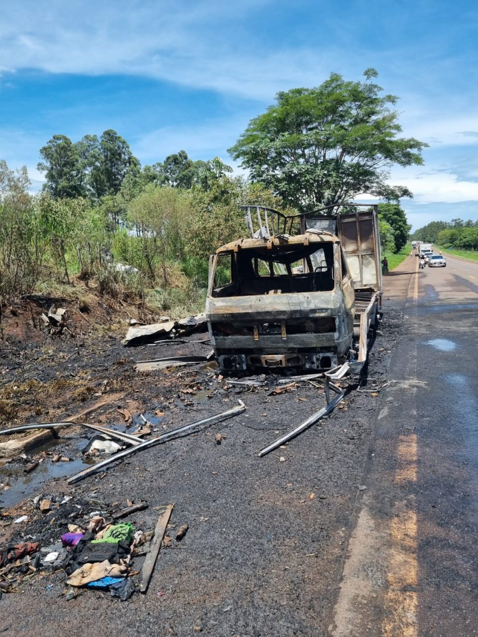 As chamas consumiram um caminhão que trafegava pela BR-272, em Goioerê, nesta quinta-feira, 7. A ocorrência foi registrada após o distrito de Jaracatiá, por volta das 10h45