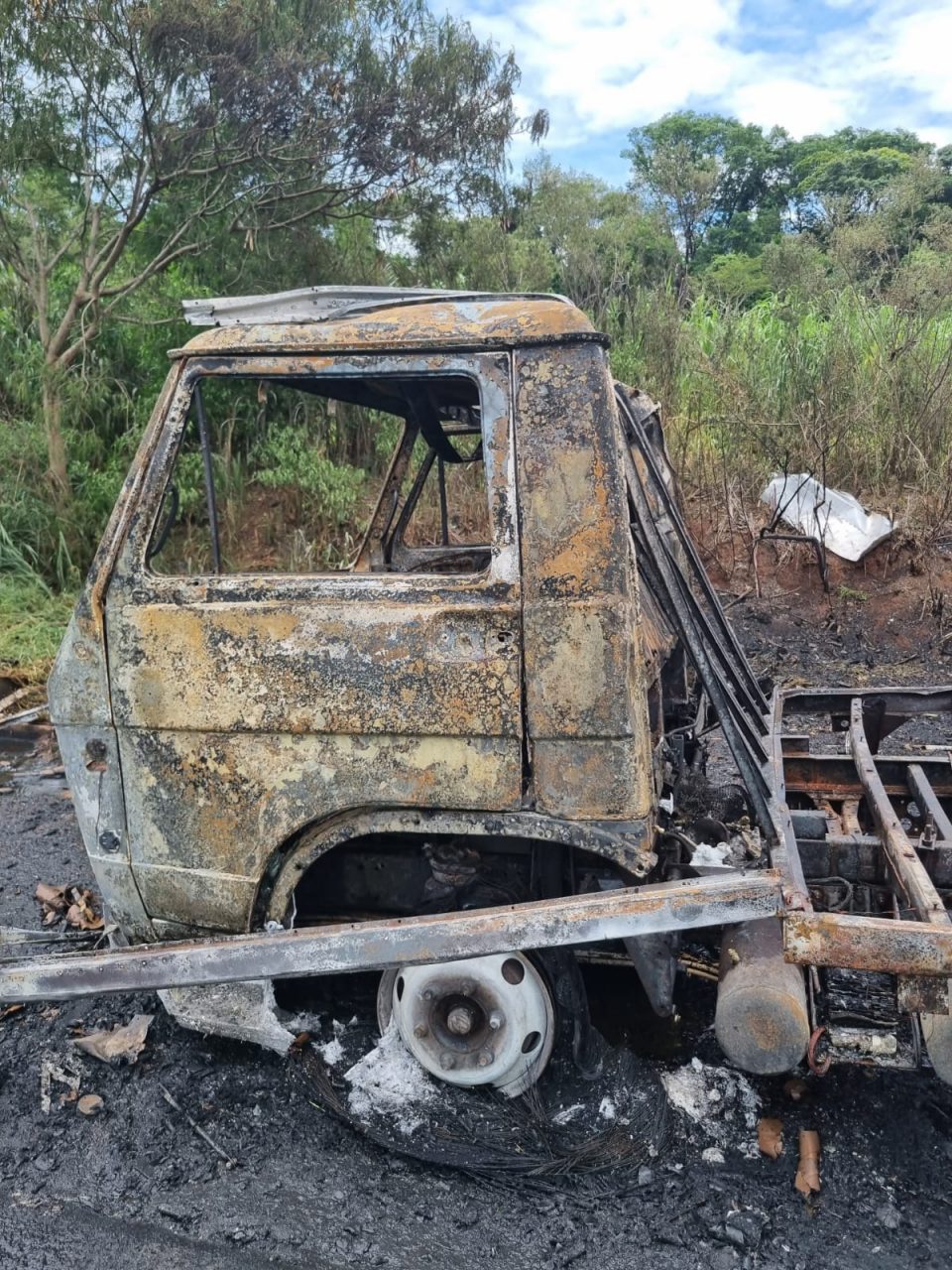 Depois de combatido o incêndio no caminhão, sobraram apenas as estruturas metálicas do veículo, comprometidas por causa do fogo.