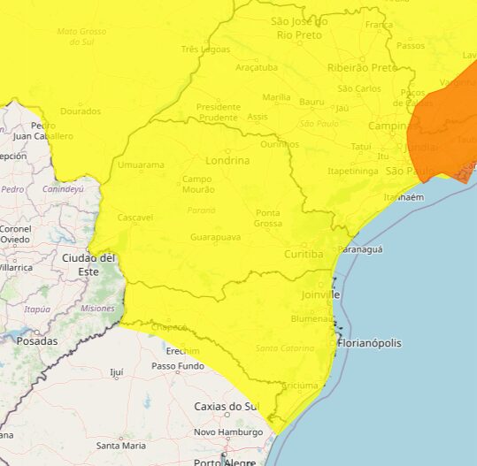 O Instituto Nacional de Meteorologia (INMET) emitiu um alerta de chuvas intensas que abrange todos os 399 municípios do Paraná, incluindo cidades como Curitiba, Londrina, Maringá, Cascavel, Foz do Iguaçu, Ponta Grossa, entre outras. O aviso meteorológico é válido até às 10h de domingo, 20.