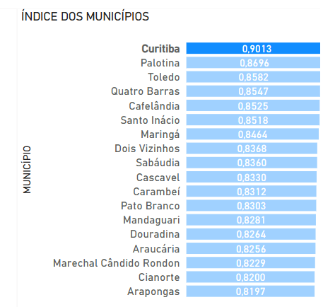 Além de Curitiba, outras cidades com alto índice de desenvolvimento são Palotina (0,8696), Toledo (0,8582), Quatro Barras (0,8547) e Cafelândia (0,8525). Também figuram entre os dez melhores: Santo Inácio, Maringá, Dois Vizinhos, Sabáudia e Cascavel – clique aqui para o ranking completo.
