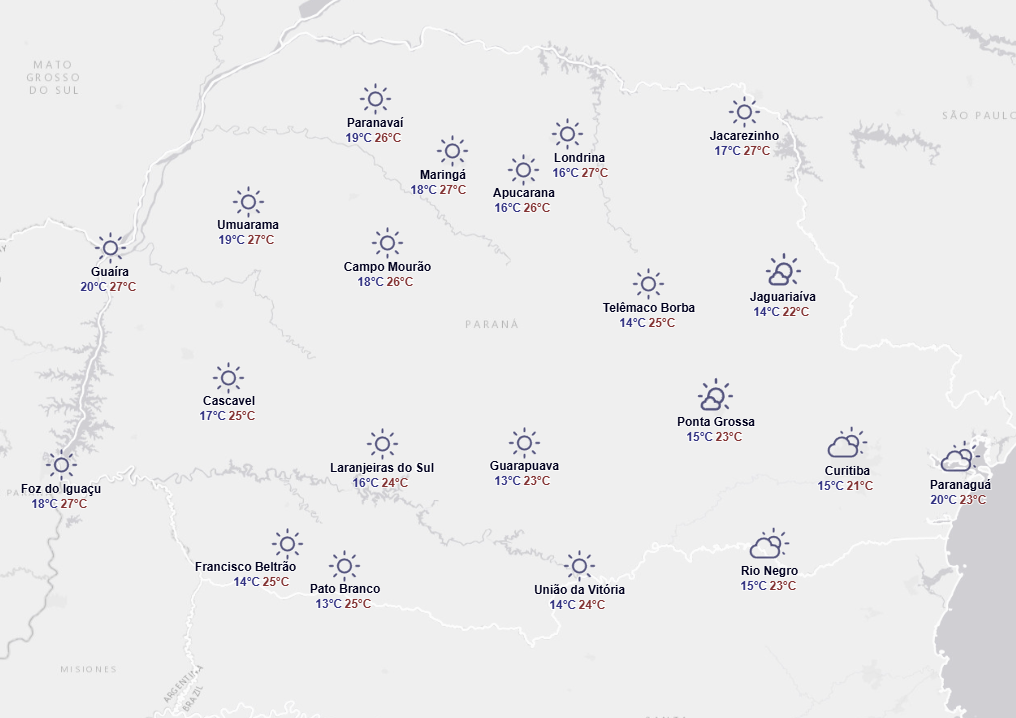 Em Maringá, os termômetros, devem oscilar entre 18 °C e 27 °C, com sol entre nuvens ao longo do dia. À noite, a nebulosidade aumenta, mas sem previsão de chuva, conforme o Climatempo. Londrina e Foz do Iguaçu apresentam condições climáticas semelhantes, com mínimas de 16 °C e 18 °C, respectivamente, e máximas de 27 °C.