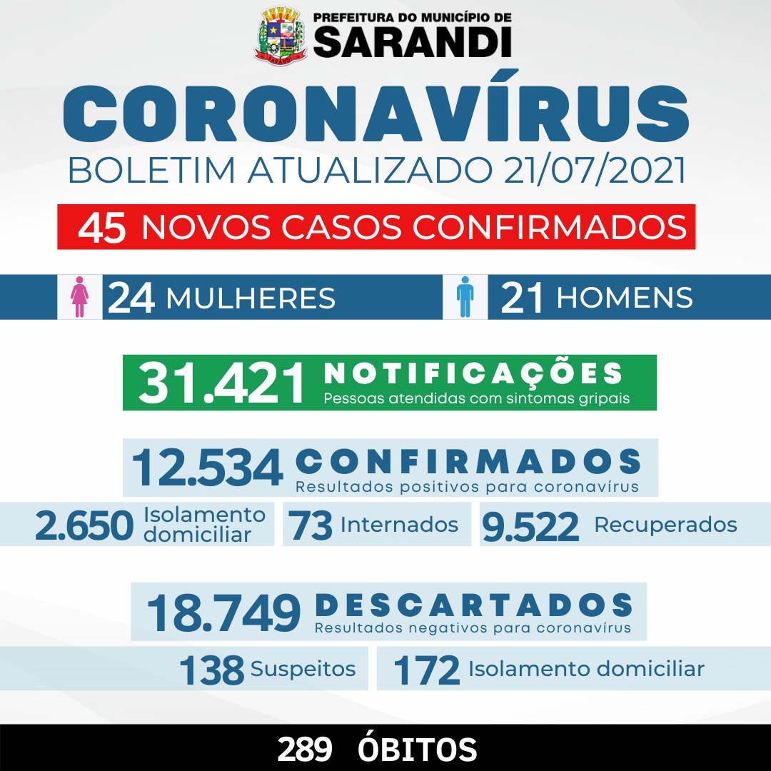 Sarandi confirmou 45 novos casos de Covid-19 no boletim epidemiológico que acompanha a evolução da doença na cidade, divulgado na tarde desta quarta-feira, 21, pela Secretaria Municipal de Saúde. De acordo com o documento, entre os novos positivados, são 21 homens, com idades entre 14 e 91 anos, e 24 mulheres, com idades entre 11 e 84 anos.