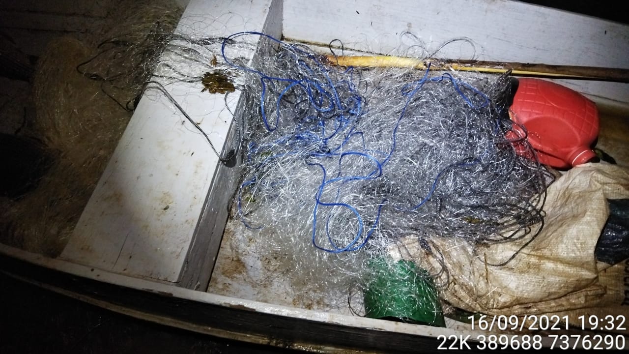 De acordo com a corporação, assim que houve o primeiro contato, um dos homens pulou na água e fugiu nadando. O segundo pescador permaneceu na embarcação e, com ele, foram encontrados 100 metros de redes, uma tarrafa, três peixes da espécie curimbatás e um peixe da espécie dourado, cuja captura está proibida.
