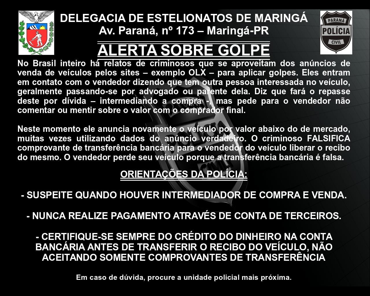 A delegacia de estelionato de Maringá fica na Avenida Paraná. O telefone é o 3309-3200.