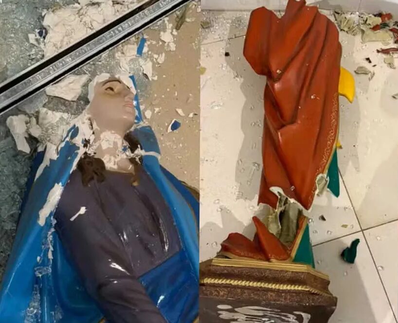 Vizinhos da igreja acionaram a Polícia Militar (PM) para atender a ocorrência. No local, o suspeito havia quebrado a porta de vidro e duas estátuas.