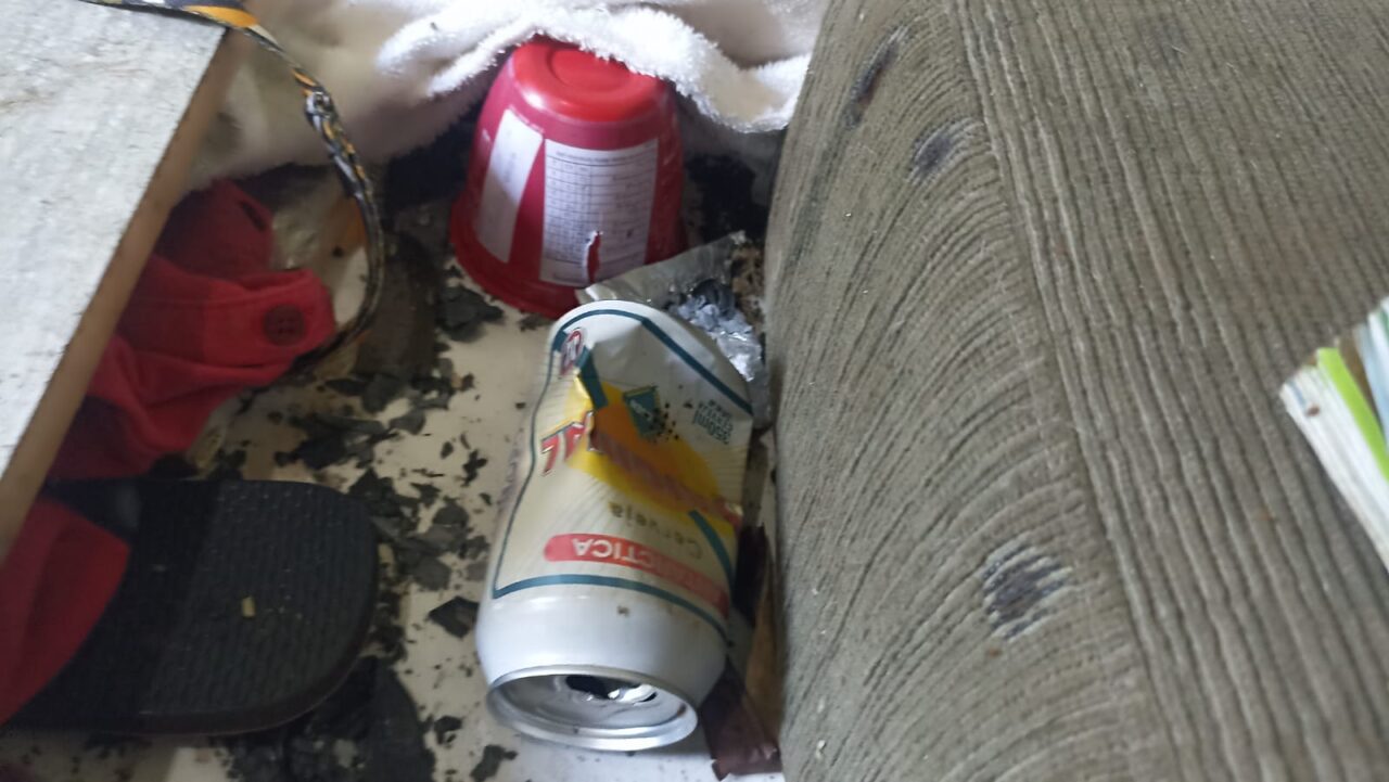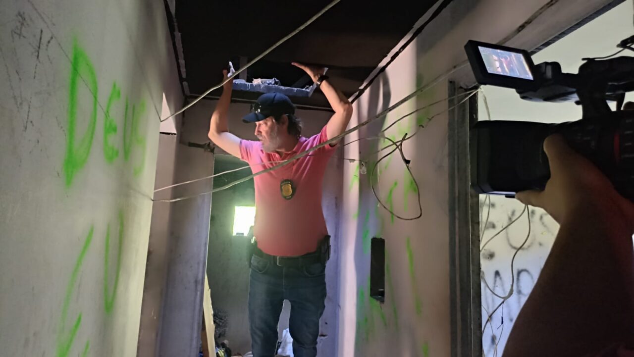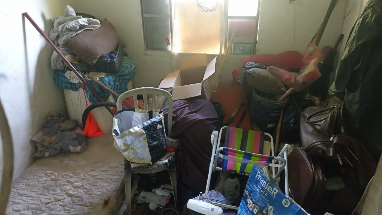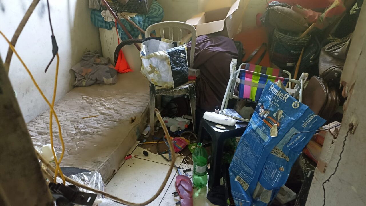 Tanto fora como no interior da casa havia entulhos, comida estragada, roupas, restos de móveis, produtos e objetos de procedência duvidosa, além do furto de energia elétrica (gato).