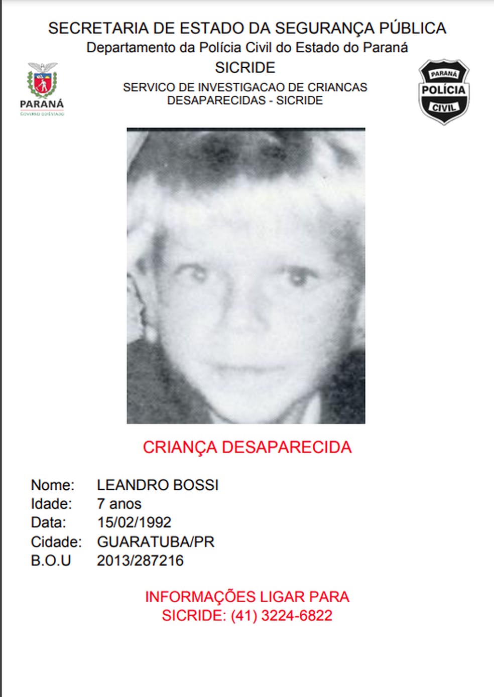 A Polícia Civil (PCPR) e a Polícia Científica do Paraná identificaram fragmentos genéticos de Leandro Bossi, que desapareceu em Guaratuba, no Litoral, em 1992, com 7 anos de idade. As novidades foram apresentadas nesta sexta-feira, 10, em coletiva de imprensa convocada pela Secretaria de Estado da Segurança Pública.