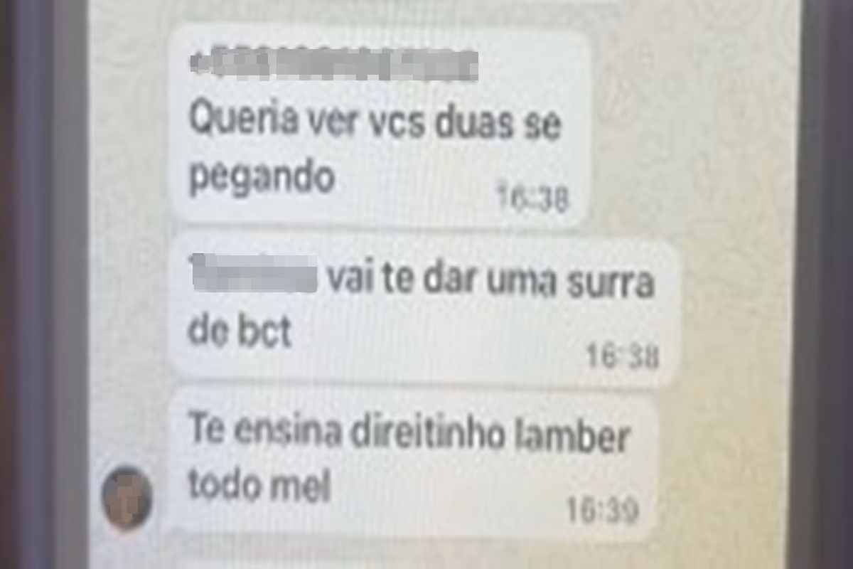 Em outras conversas, ele menciona: “Queria ver vocês duas se pegando”. Em outra, afirma que outra menina “vai te var uma surra de bct”. Na sequência ele escreve: “Te ensina direitinho a lamber todo mel”.