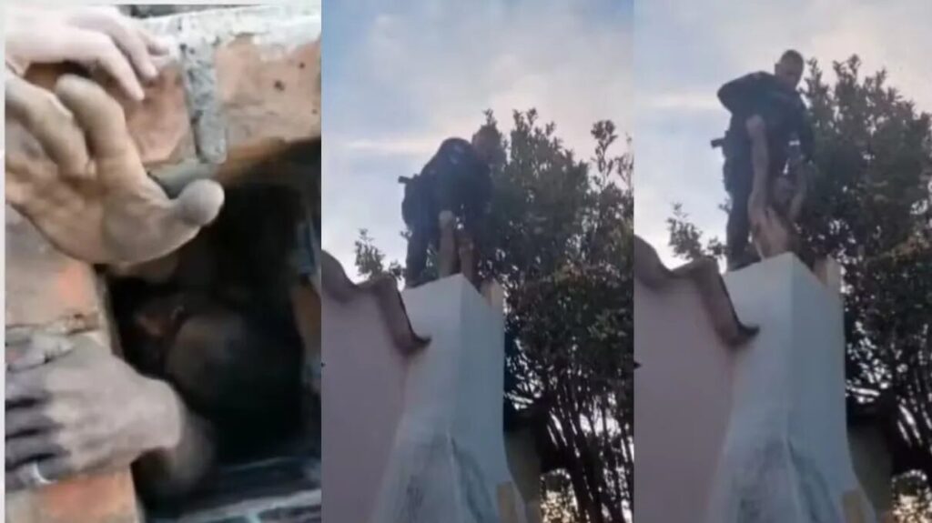 Um vídeo mostra o homem sendo retirado da estrutura por um Guarda Civil Municipal, que o puxou para cima pelos braços.