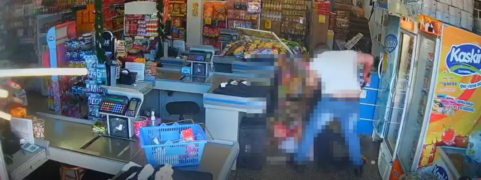 A vítima, identificada como Valter Miranda, então, entra no local já ensanguentada e tenta correr do filho, que o persegue empunhando um facão. Clientes e funcionários tentam se esconder e observam o ataque. Logo após colaboradores deixarem o local, a câmera flagra o momento em que o pai cai sobre uma prateleira e continua sendo atacado pelo filho.