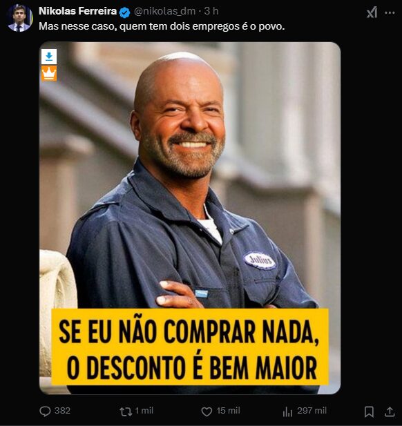 A partir da referência ao personagem Julius, da série americana Todo mundo odeia o Chris, conhecido por gostar de obter os maiores descontos possíveis, Nikolas fez uma montagem com o rosto de Lula, com a famosa frase dita pelo personagem: “se eu não comprar nada, o desconto é bem maior”.