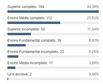 Do total de candidatos, 194 (44,39%) têm nível superior completo, 50 (11,44%) têm superior incompleto e 112 (25,63%) concluíram o ensino médio. Além disso, 23 (5,26%) candidatos não terminaram o ensino fundamental e dois (0,46%) declaram que sabem ler e escrever.
