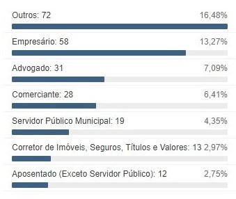 Dos candidatos, 58 (13,27%) são empresários. A ocupação é a mais comum entre os concorrentes em Maringá. Em seguida está a profissão de advogado, com 31 (7,09%) candidatos, comerciante com 28 (6,41%), servidor público municipal com 19 (4,35%) e corretor de imóveis, seguros títulos e valores, com 13 (2,97%) candidatos.