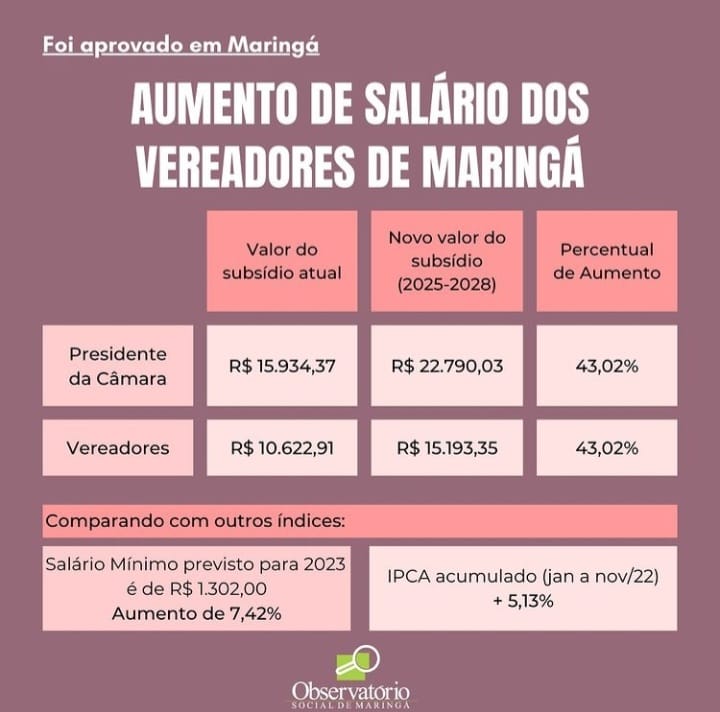 “Para se ter uma ideia, o valor do salário mínimo no Brasil está previsto a aumentar 7,42% em 2023 e o índice acumulado do IPCA no ano de 2022 (jan-nov) foi de 5,13%. Um percentual bem inferior quando comparado aos valores aumentados para os legisladores municipais”, diz o Observatório Social – veja abaixo a publicação completa.