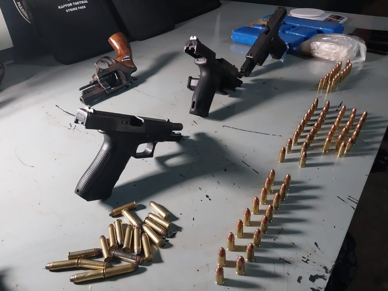 Pistolas, revólver e munições apreendidas. Foto: GMC Online
