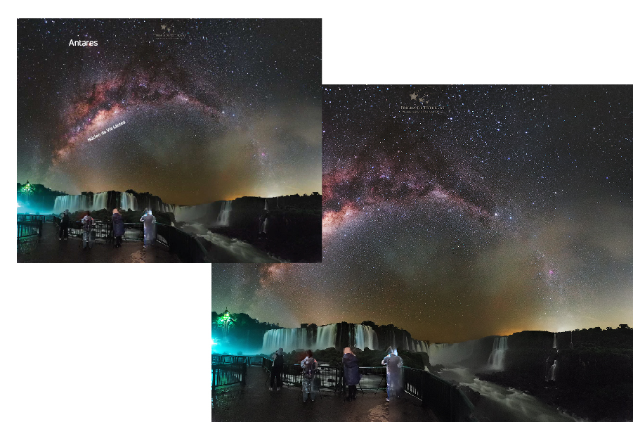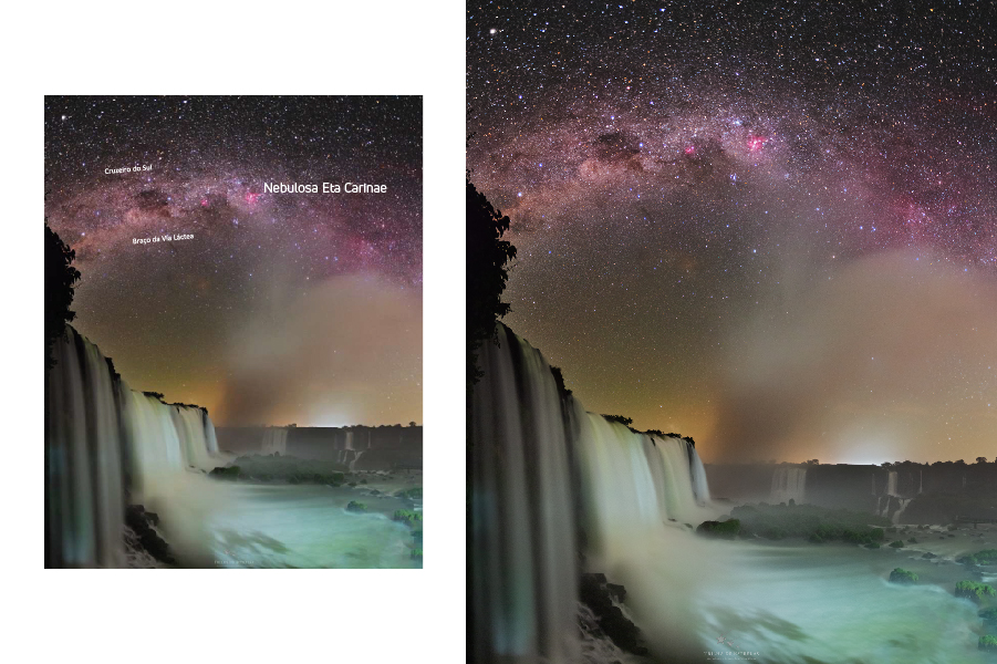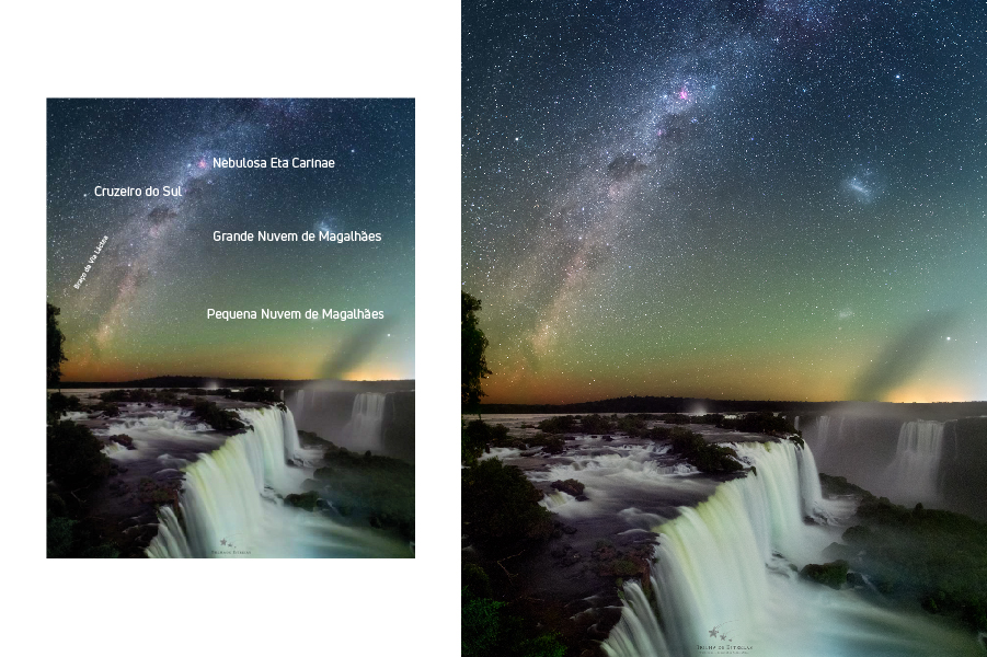 Já à direita, observa-se a grande e a pequena Nuvens de Magalhães, duas galáxias-satélites anãs irregulares da nossa galáxia. As duas podem ser vistas a olho nu no Hemisfério Sul. Os registros completos, bem como todas as explicações, estão presentes no blog Cataratas do Iguaçu (acesse aqui).