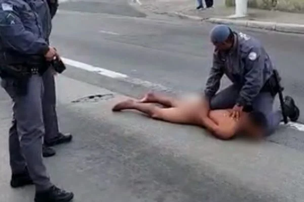 Nas imagens, o homem sem roupa fica diante de um carro, contra o qual bate com um pedaço de fio, semelhante aos usados em postes de telefonia. Em seguida, três policiais se aproximam. Um deles, portando uma arma de choque, consegue conter o homem, que cai no meio da avenida.