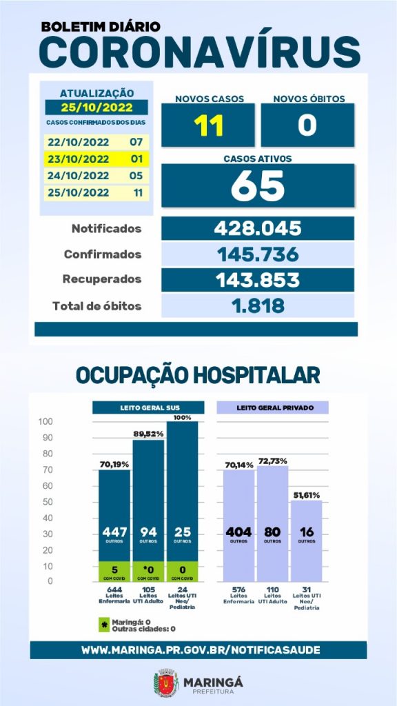 Desde o início da pandemia, Maringá soma 145.736 casos confirmados de covid-19. Desses, 143.853 já estão recuperados, 65 são casos ativos (pacientes em isolamento domiciliar ou internados) e 1.818 morreram por complicações da doença.
