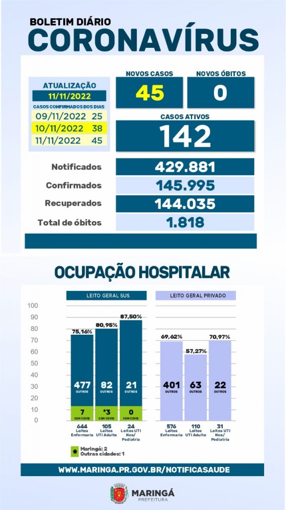 Veja mais detalhes do boletim do coronavírus desta sexta-feira, 11 de novembro, em Maringá: