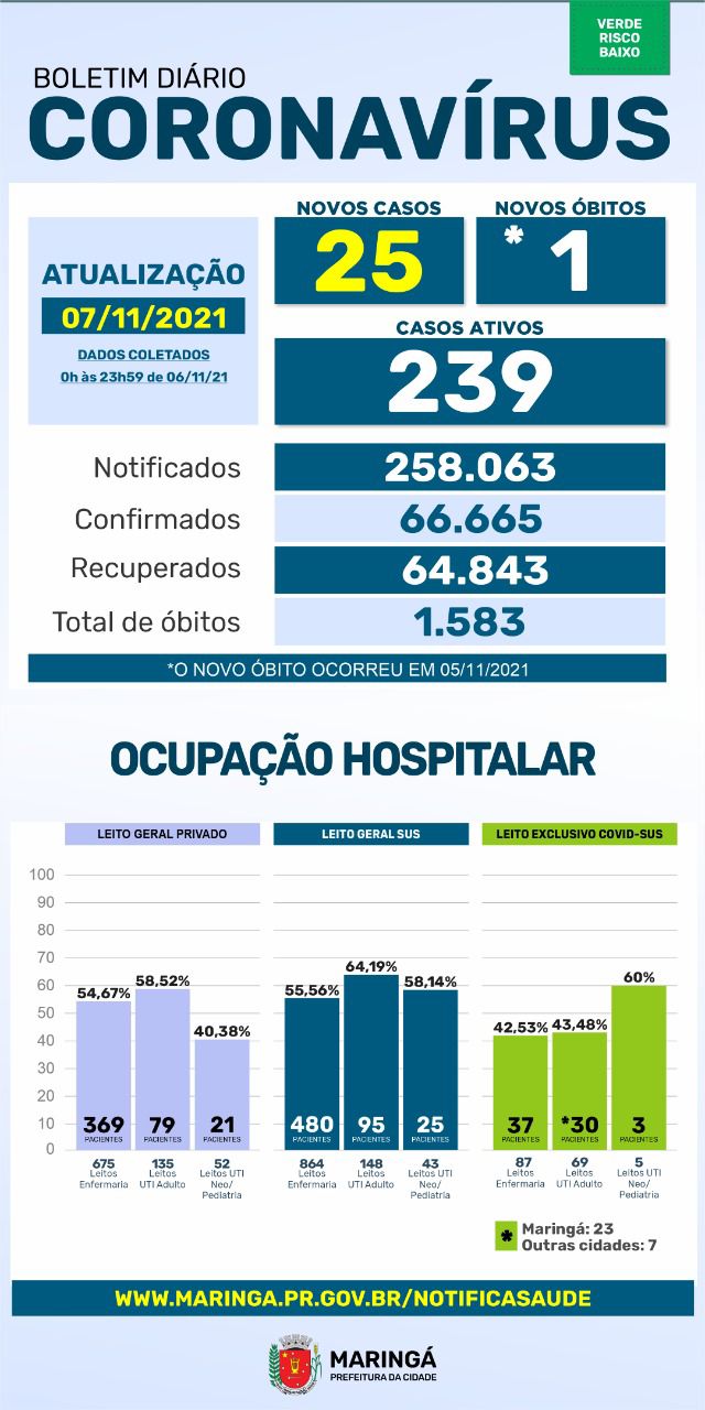 O município soma 66.665 casos positivos de coronavírus desde o início da pandemia. Desses, 64.843 já estão recuperados, 239 são casos ativos (pacientes em isolamento domiciliar ou internados) e 1.583 morreram por complicações da doença.