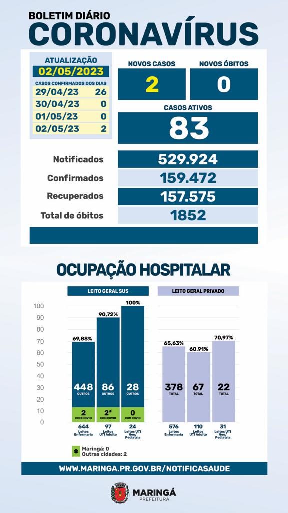 Desde o início da pandemia, Maringá soma 159.472 casos confirmados de covid-19. Desses, 157.575 já estão recuperados, 83 são casos ativos (pacientes em isolamento domiciliar ou internados) e 1.852 morreram por complicações da doença.