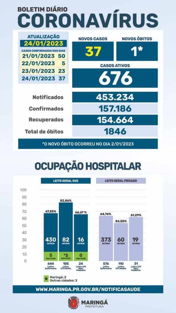 Desde o início da pandemia, Maringá soma 157.186 casos confirmados de covid-19. Desses, 154.664 já estão recuperados, 676 são casos ativos (pacientes em isolamento domiciliar ou internados) e 1.846 morreram por complicações da doença.
