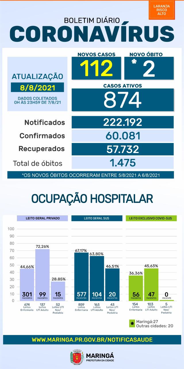 A Secretaria de Saúde de Maringá confirmou 112 novos casos de covid-19 e duas mortes no boletim deste domingo, 8. O documento divulgado nesta tarde aponta que são 874 casos ativos no momento, ou seja, de pessoas que estão contaminadas pelo vírus e que podem transmitir para outras. A bandeira continua em laranja, o que significa risco alto de contaminação.