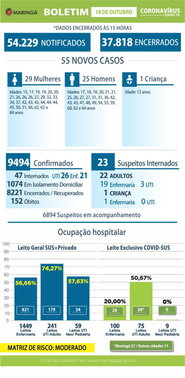 O boletim diário da covid-19 em Maringá informa que nas últimas 24 horas a cidade teve 55 novos casos confirmados da doença, na tarde deste domingo, 18. Os novos infectados são 29 mulheres, 25 homens e 1 criança.